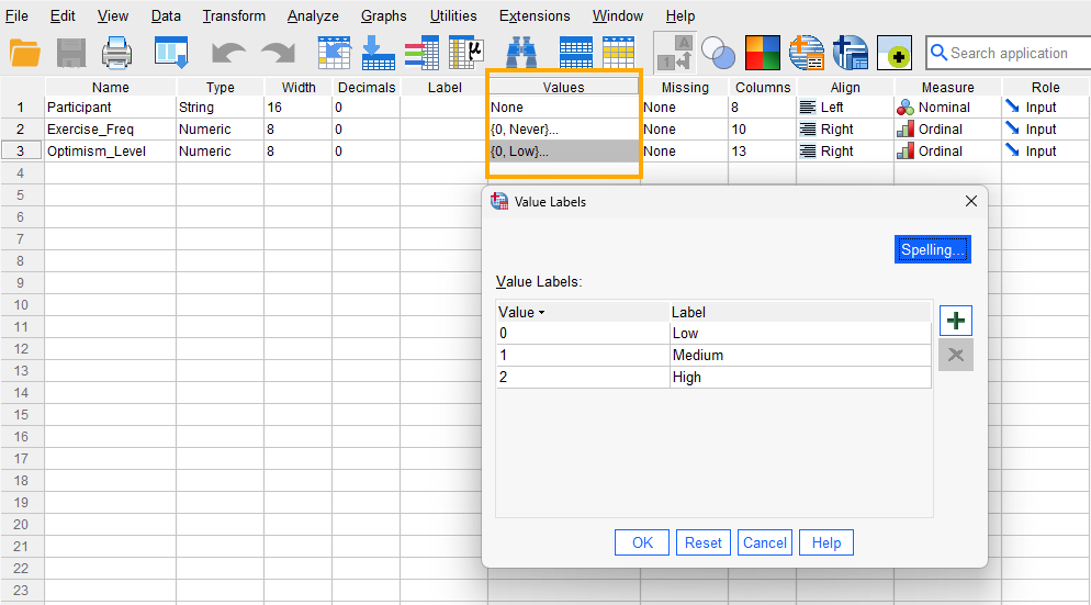 For the variable representing the Exercise frequency, although we use words (Never, Sometimes, Often), we assign numbers to them (e.g., Never = 0, Sometimes = 1, and Often = 2). Therefore, we choose “Numeric” as the data type and select “Ordinal” as the measurement level. To associate numbers with the frequency of exercise, in the Value column, click on the cell in the Exercise_Freq row to open a window. In the Value box, enter 0 and in the Label box, enter “Never,” then click “add.” Repeat this process with Value 1 for the “Sometimes”, and 2 for “Often”. Then add and close the window. Repeat the same for the ordinal variable Optimism_Level (0 for Low, 1 for Medium, and 2 for High). Figure 1 shows how to create these value-label pairs for Exercise frequency and Optimism level.