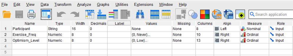 To enter the data in the SPSS program, first we click on the Variable View tab (bottom left) and create three variables: Participant, Exercise frequency, and Optimism level. We specify the following attributes for each variable: