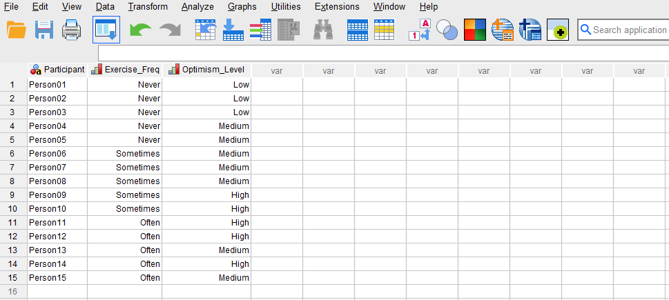 Once the variables are created, we switch to Data View of SPSS program to enter the data into the columns Participant, Exercise_Freq, and Optimism_Level. As specified in the Variable View, for Participant we can enter their names or an ID. For the variables Exercise_Freq and Optimism_Level, we can either directly type the numerical values (0, 1, 2) or their associated labels (e.g., Never, Sometimes, Often). Figure 3 shows how the data for all three variables should look like in the Data View tab.