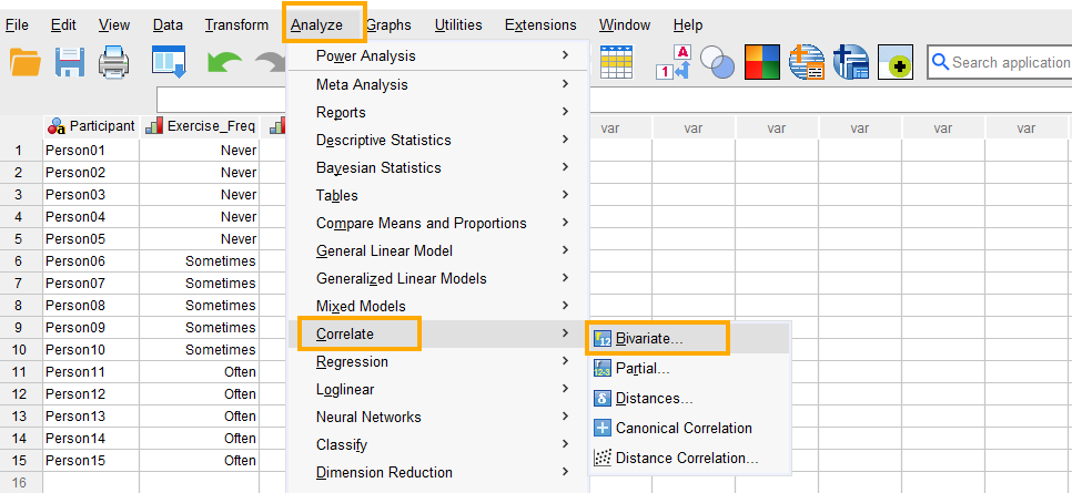 In SPSS, the Kendall tau-b correlation can be run through the menu Analyze / Correlate / Bivariate. So, as Figure 4 shows, we click on Analyze and then choose Correlate and then Bivariate (bivariate means two variables).