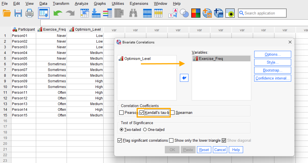 Now we are ready to run the Kendall tau-b correlation in SPSS!