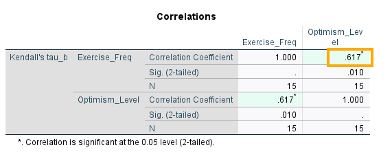 The correlation table in Figure 6 has two rows (Exercise frequency and Optimism level). They both show the Kendall’s tau-b correlation coefficient. The last column shows that the Kendall’s tau-b correlation coefficient between Exercise frequency and Optimism level is 0.617 and positive, which is also statistically significant (Sig. 2-tailed = 0.010 or p < 0.05). So, we can conclude that there is a moderate correlation between Exercise frequency and Optimism level.