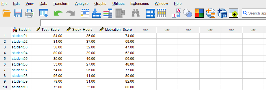 Once the variables are created, we can enter the data into the columns Student, Study_Hours, Motivation_Score, and Test_Score in the Data View tab of SPSS program. For Student, we can enter their names or an ID. For the variable Study_Hours, we enter the number of hours each student reports studying. For the Motivation_Score, we enter the students’ scores on the motivation questionnaire. Finally, we enter the test scores in Test_Score column for each student. Figure 2 shows how the data for all three variables should look like in the Data View tab.