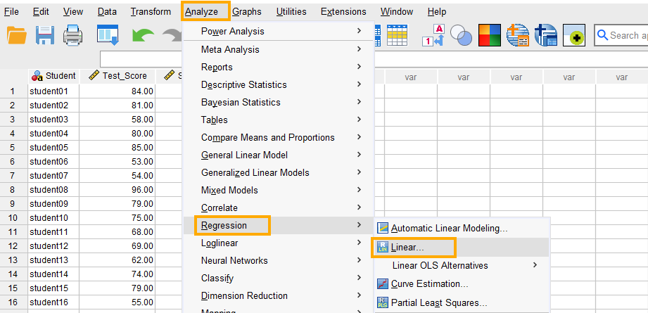 In SPSS, multiple linear regression can be accessed through the menu Analyze / Regression / Linear. So, as Figure 3 shows, we click on Analyze and then choose Regression and then Linear.