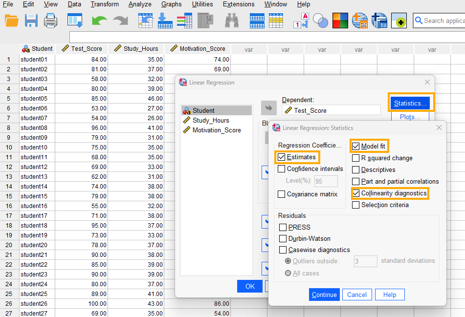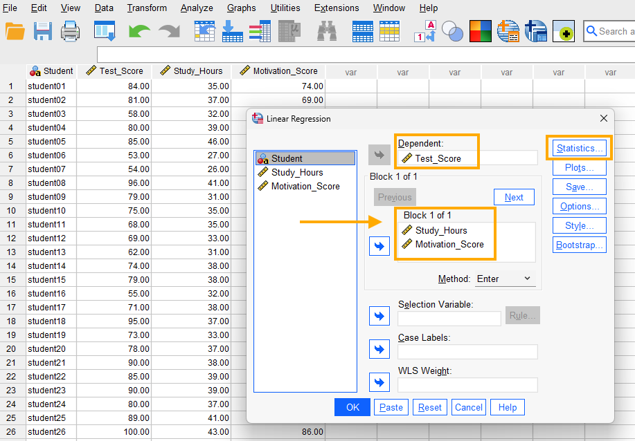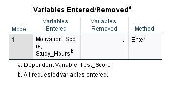 As Figure 5 shows, there are two independent variables entered into our model: Study hours and Motivation score, with Test score as our dependent variable.