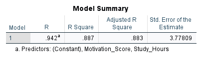 Adjusted R Square takes into account factors that inflate R Square, such as the number of independent variables. So, we recommend looking at Adjusted R Square as a more unbiased measure of the informativeness of our independent variables. In this example, the adjusted R Square is 0.883, implying that the linear combination of Study hours and Motivation score can explain about 88% of the variance in the dependent variable in the model while about 12% of variance (1 – 0.88 = 0.12) remains unaccounted for (we do not know the source of variance).