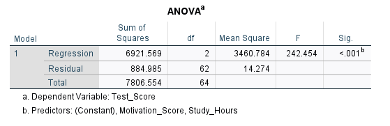 The ANOVA table provides two sources of variance and calls them Sum of Squares: Regression sum of squares and Residual sum of square. The Regression part shows the information, and the Residual part shows noise or unknown information. We want a high information to noise ratio (also known as signal to noise ratio). The higher this ratio, the more likely our model will be statistically significant and meaningful. In this ANOVA table, we can see that F = 242.454 and is statistically significant (p < 0.05). So, our regression model is statistically significant. The F value is calculated as the ratio of mean sum of squares of the regression to residual values (3460.784 / 14.274 = 242.454).