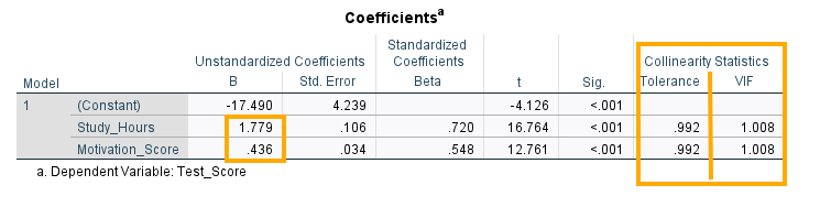 The next two rows in the Coefficients table show the coefficients for (effects of) the two independent variables Study hours and Motivation , which are 1.779 and 0.436, respectively, and which are both positive and statistically significant (p < 0.01).