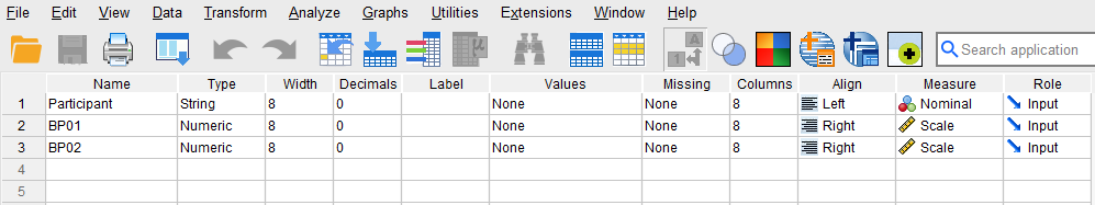 To enter the data in the SPSS program, start by clicking on the Variable View tab (bottom left) and create three variables under the name column: Participant, BP01 (blood pressure at time 1), and BP02 (blood pressure at time 2). Specify the following attributes for each variable: