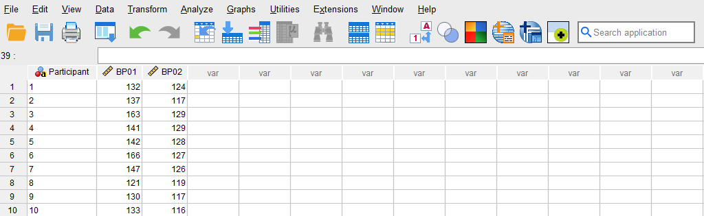 Once the variables are created, we can enter the data in the columns Participant, BP01, and BP02. As specified in the Variable View, for Participant we can enter their names or an ID. For the variables BP01 and BP02, we can directly enter the blood pressure readings at time 1 (BP01) and at time 2 (BP02), or copy and paste from a spreadsheet. Figure 2 shows the blood pressure data for the first five participants in the Data View window of the SPSS program.