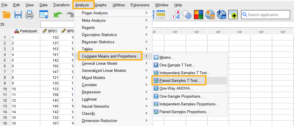 In SPSS, the paired samples t-test can be accessed through the menu Analyze / Compare Means and Proportions / Paired-Samples T Test. As shown in Figure 4, we click on Analyze, then choose Compare Means, and finally select Paired-Samples T Test.