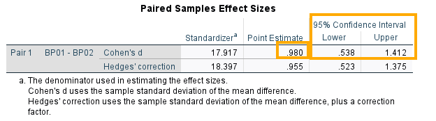 As shown in Figure 8, Cohen’s d effect size is 0.98, which indicates the change from BP01 to BP02 is large and meaningful. The average person in the sample showed almost a full standard‑deviation shift between the two blood pressure measurements. In addition, the 95% confidence interval is above 0 and shows moderate to large effect size (0.54 to 1.41).