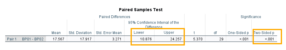 According to the descriptive statistics, the mean blood pressure before the consumption of cardamom was 139.40 and the mean blood pressure after the consumption of cardamom was 121.83, which shows a decrease of 17.57. But is a 17.57 drop in blood pressure statistically significant to claim the relative effectiveness of cardamom in lower blood pressure? We can determine this by referring to the Paired Samples Test table (the third table in the SPSS output and Figure 7 below).